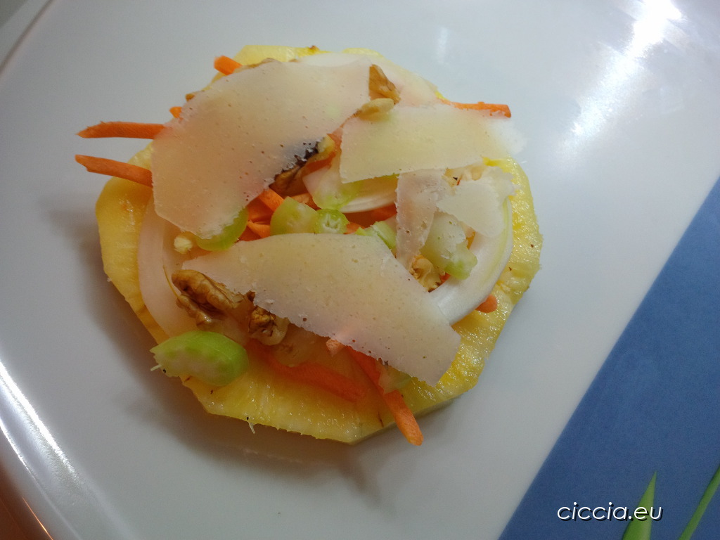Disponete una fetta di ananas su di un piatto di portata e metteteci sopra un pò di carote, di sedano e di finocchio.