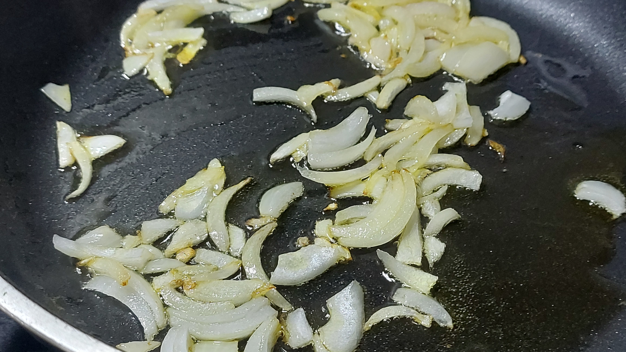 Affettate finemente la cipolla e fatela rosolare in un tegame o una padella antiaderente con un pò di olio extravergine d’oliva.