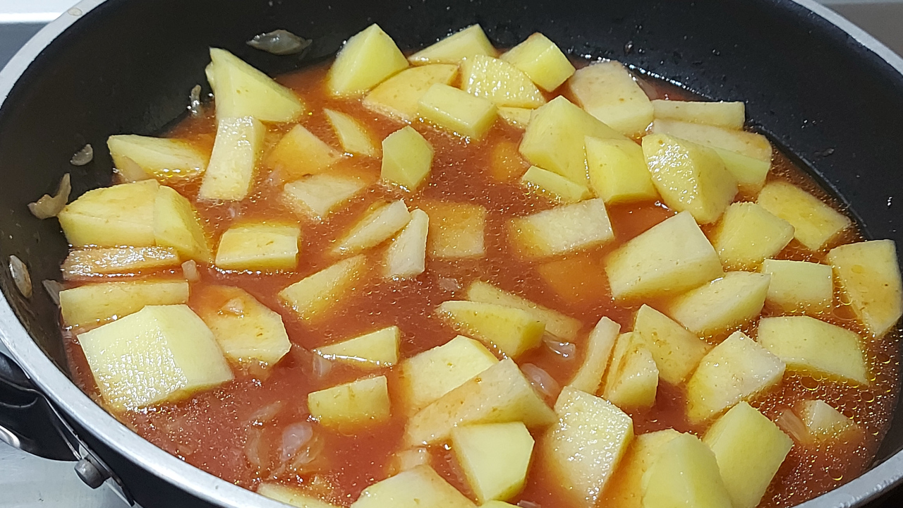 Quando la cipolla sarà dorata aggiungete le patate tagliate e lasciatele insapore per qualche minuto mescolando delicatamente.