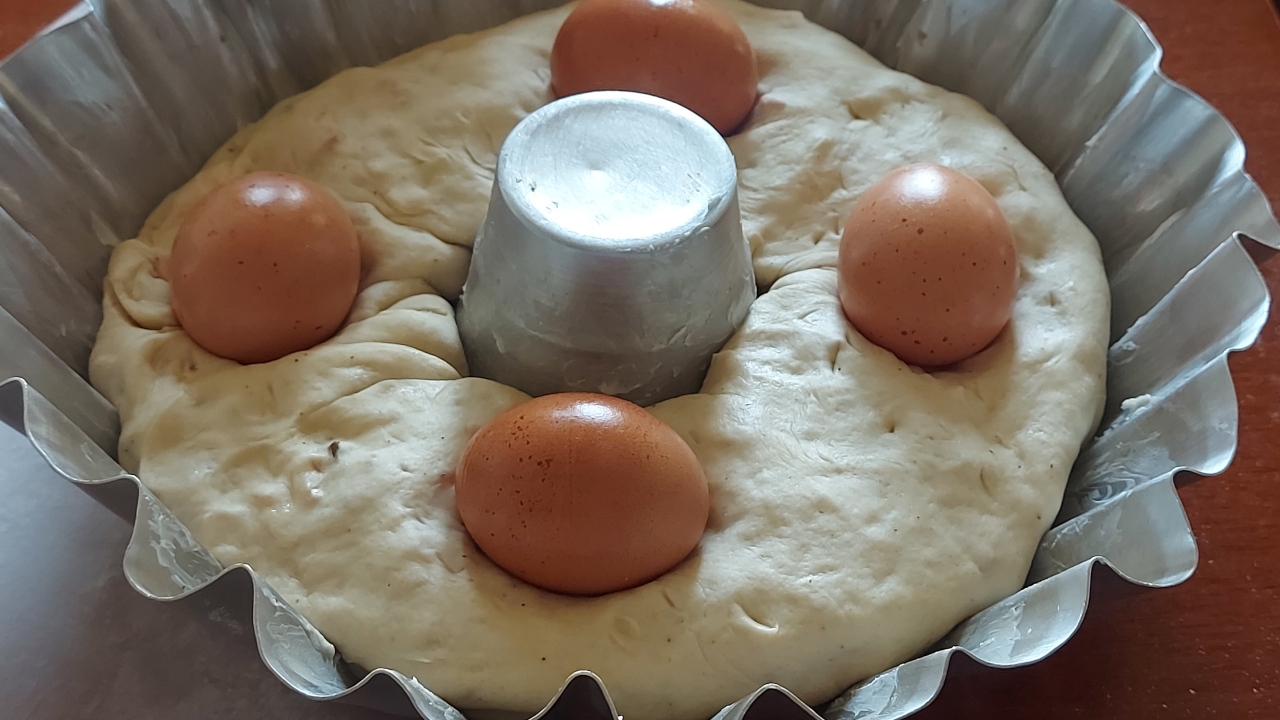 Quando il casatiello sarà lievitato disponete le uova, lavate e asciugate, a intervalli regolari premendo delicatamente sulla superficie dell’impasto