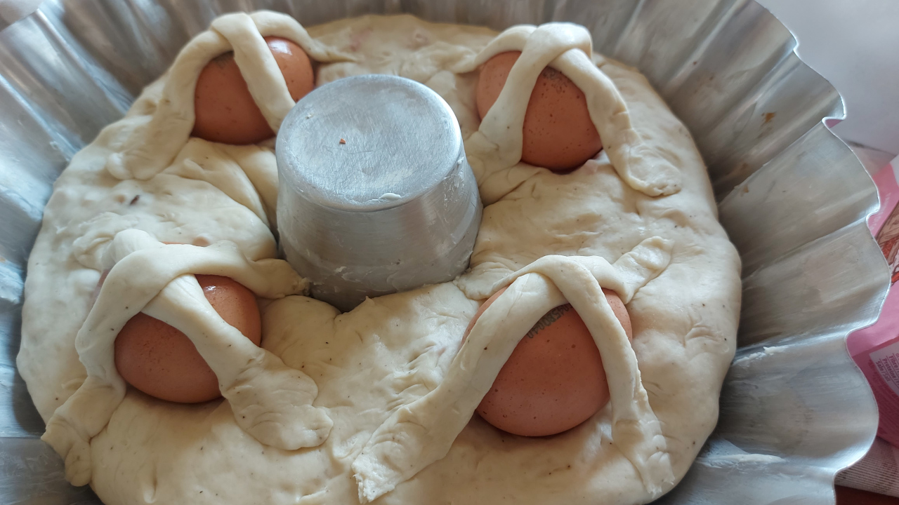 Nel casatiello le uova sono posizionate intere, crude e con il guscio.