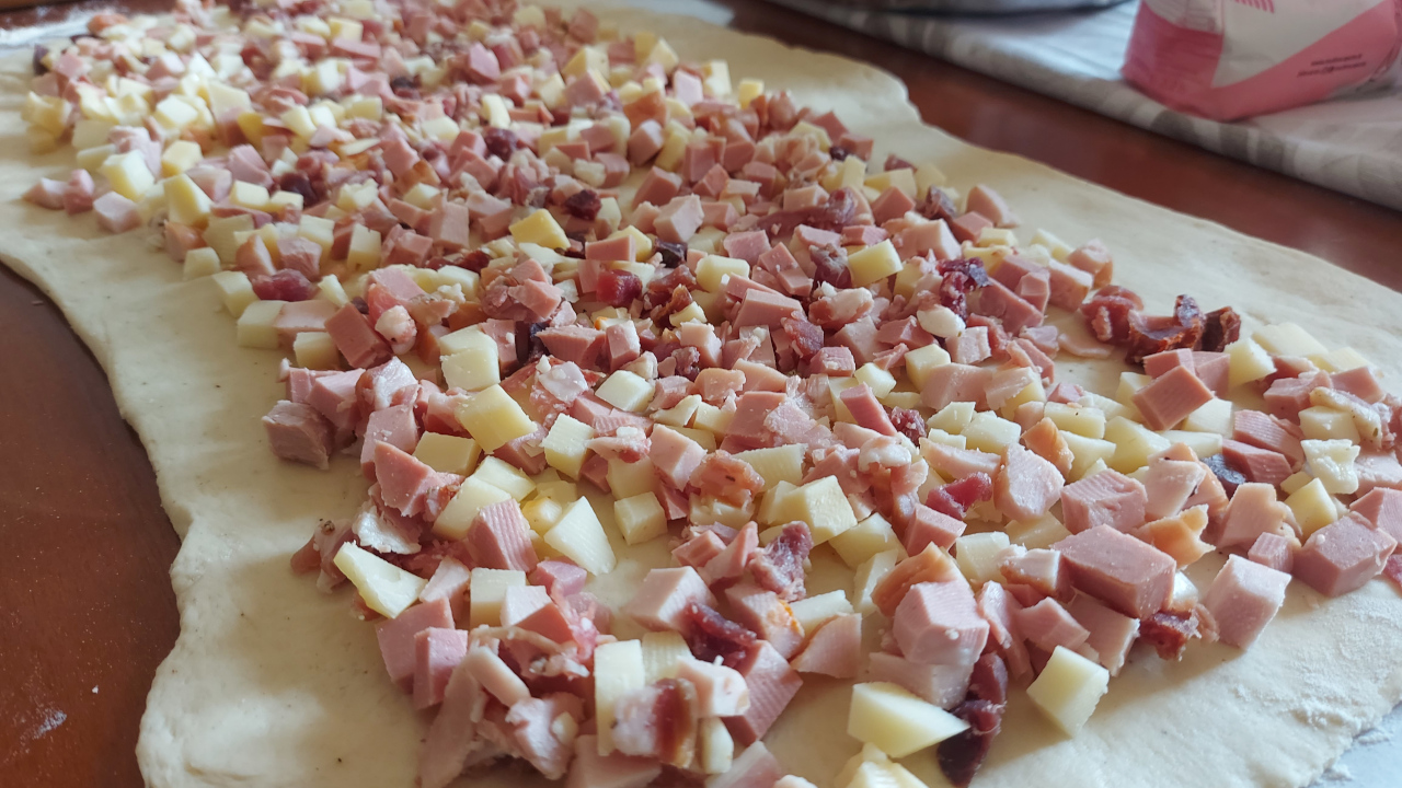Il casatiello napoletano è una ricetta rustica napoletana tipica di Pasqua, fatto con pane, sugna e pepe e farcito con formaggi e salumi.