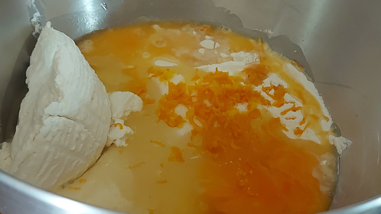 Mettete in una planetaria, la farina, le uova, lo zucchero, la buccia di arancia grattugiata, il succo di arancia, il lievito per dolci e la ricotta ben asciutta.