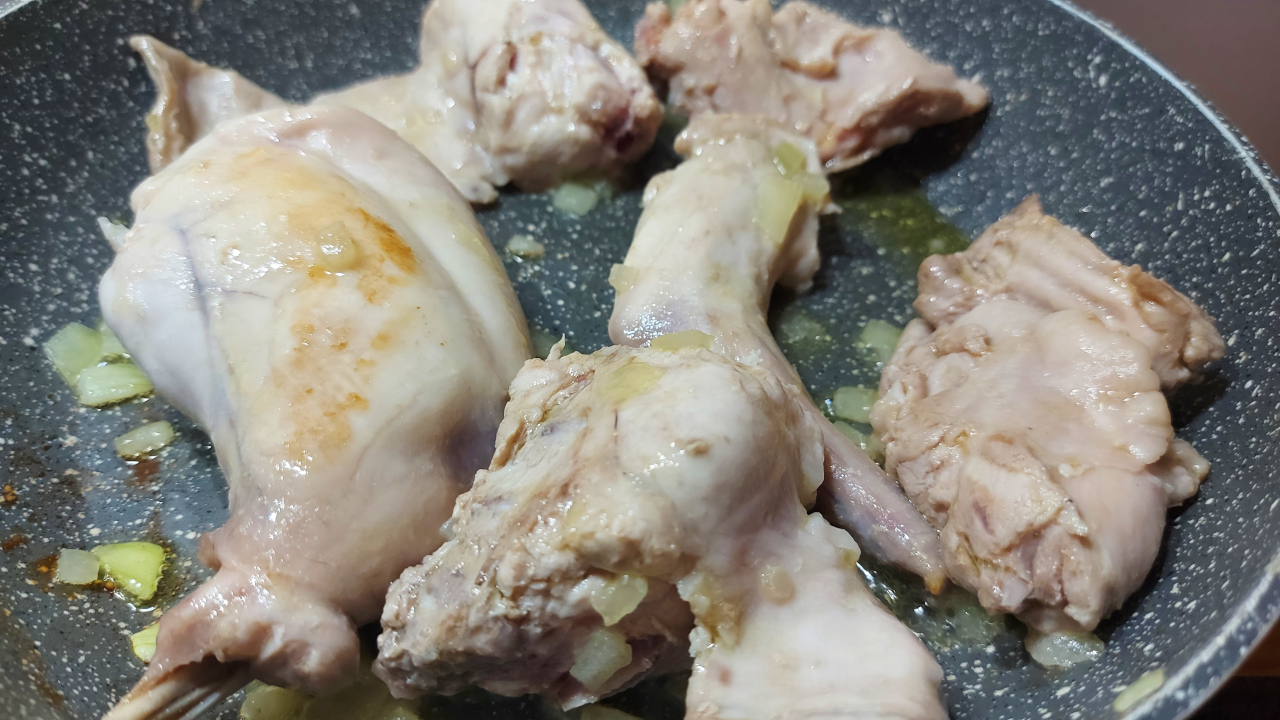 Girate spesso i pezzi di coniglio per farli rosolare bene da tutte le parti ed evitare che si attacchino alla padella.