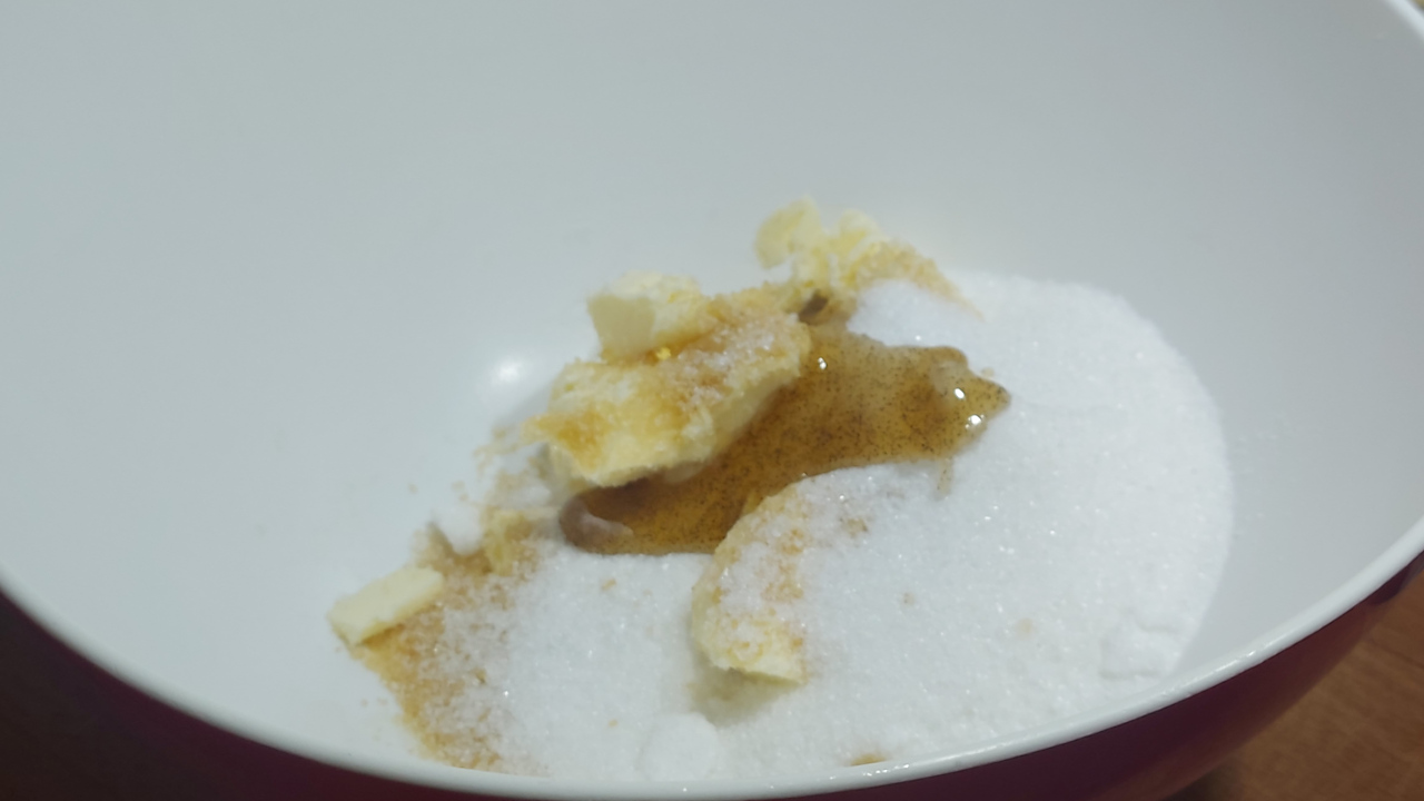 Mettete in una ciotola capiente il burro, lo zucchero di canna,lo zucchero semolato e l’estratto di vaniglia.