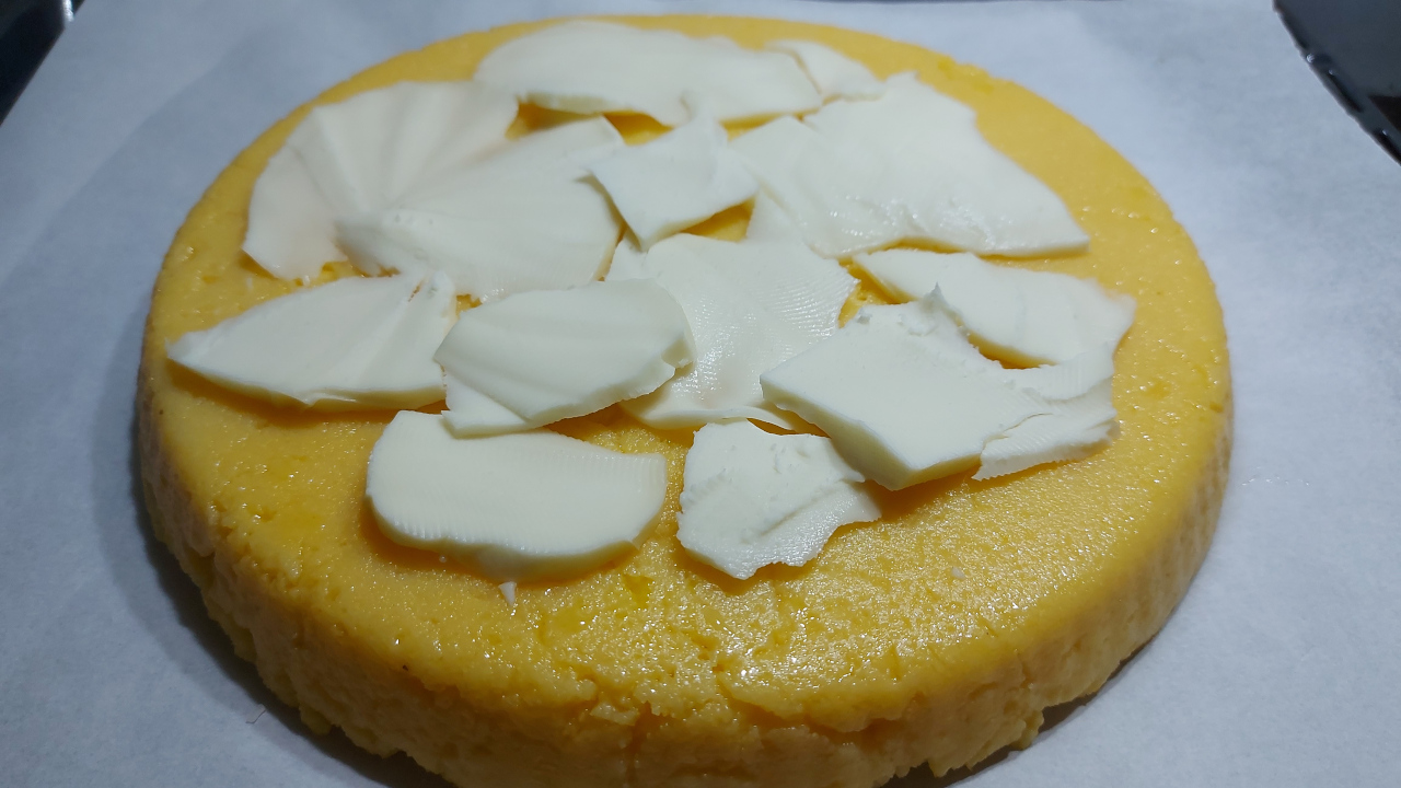 Sfornate la base della polenta su una teglia ricoperta di carta da forno.