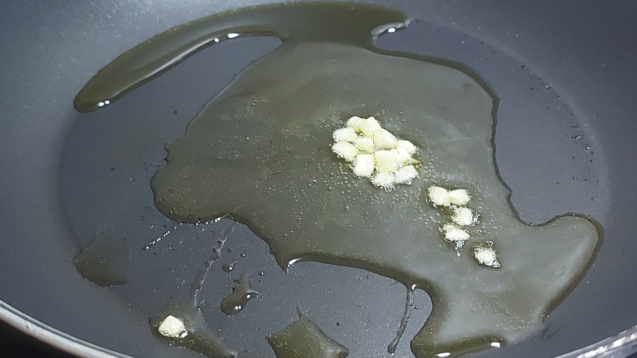 In una padella antiaderente fate rosolare l’aglio tagliato a pezzetti con l’olio extravergine d’oliva.