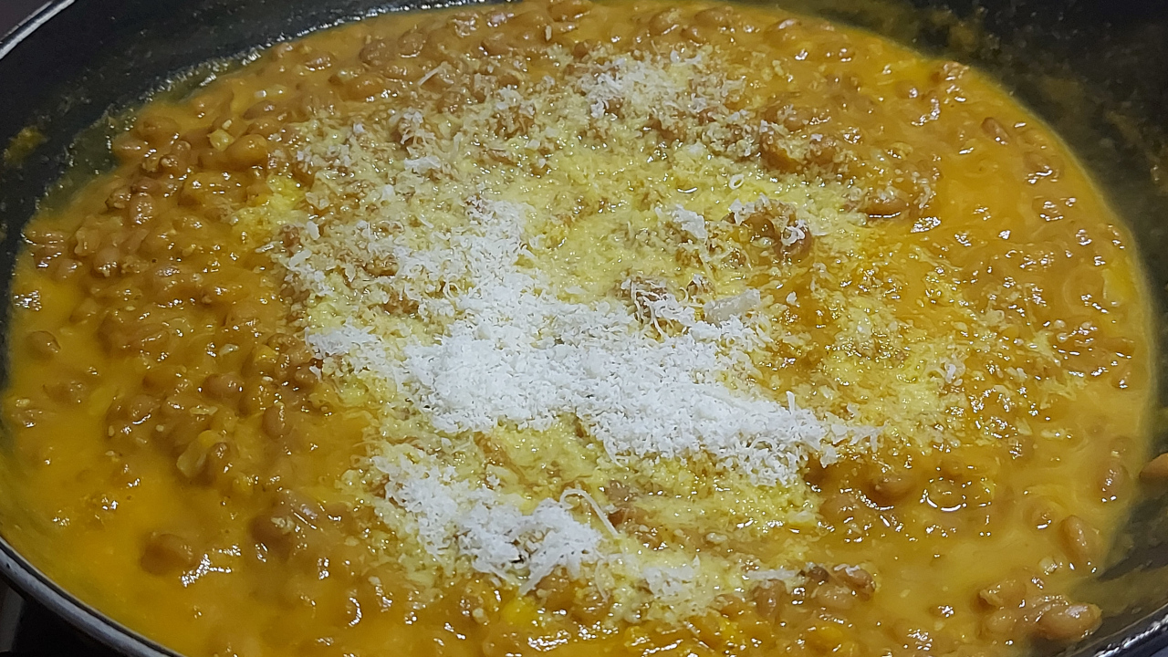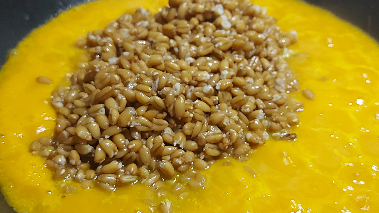 Versate la zucca frullata nella padella e aggiungete anche il farro lessato.