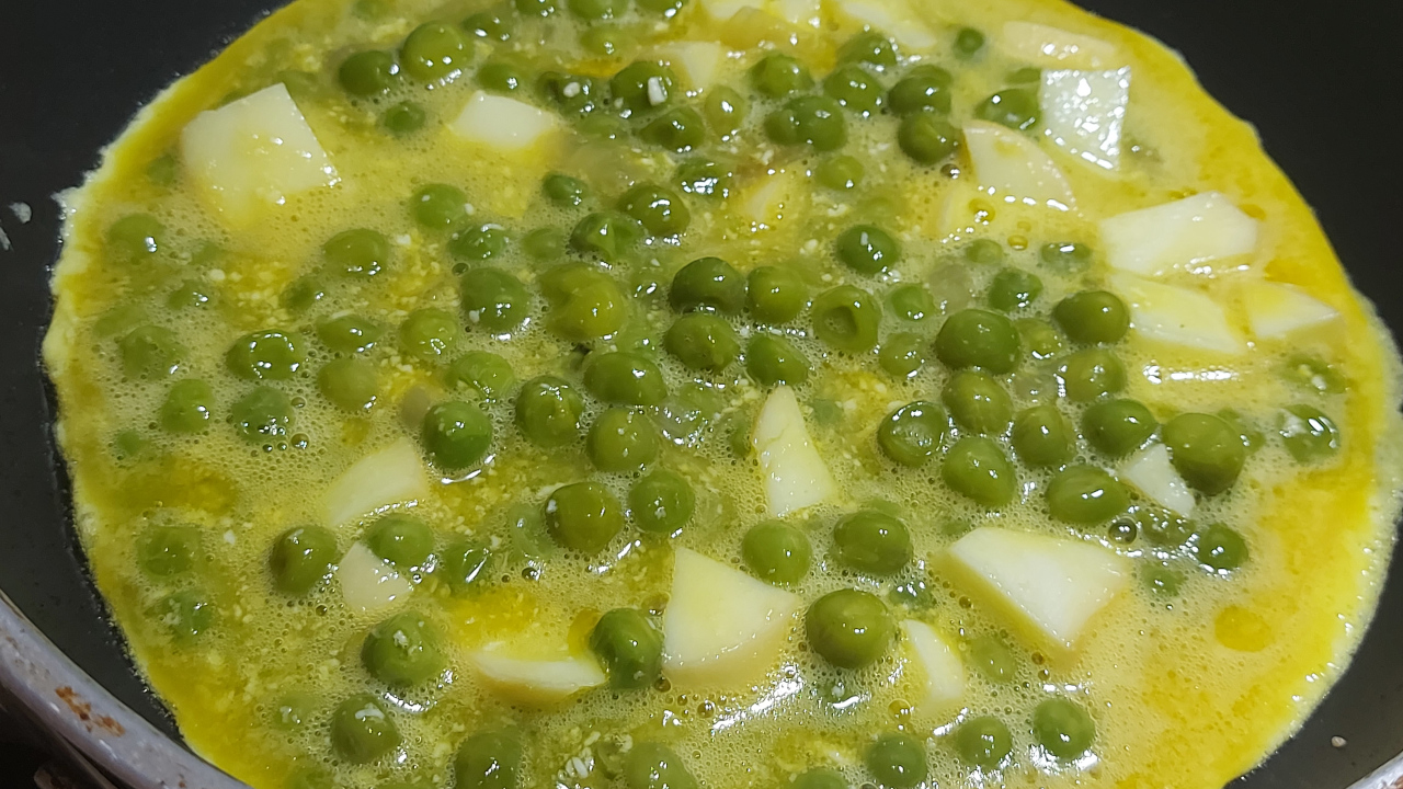 Ungete una padella antiaderente e fatela scaldare, poi versate il composto di uova e piselli e distribuitelo in modo uniforme.