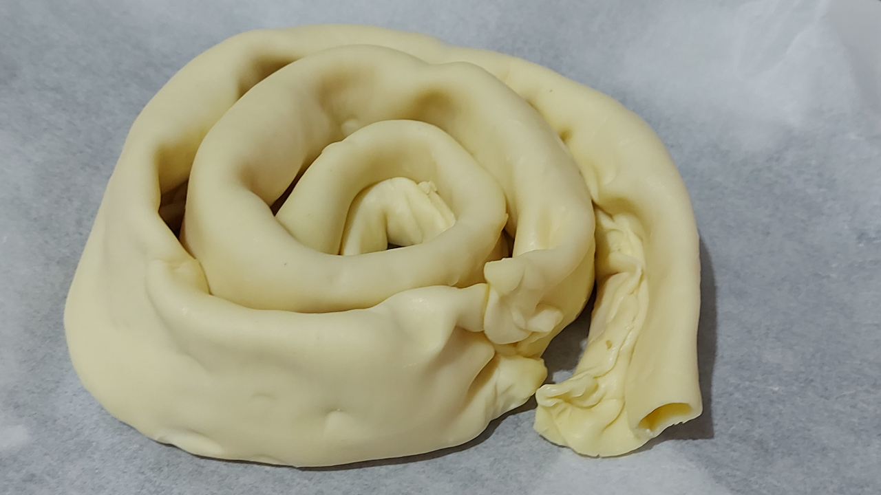 Continuate in questo modo fino a terminare tutti i cilindri di pasta sfoglia ripiena, facendo attenzione a far aderire bene tutte le congiunzioni.
