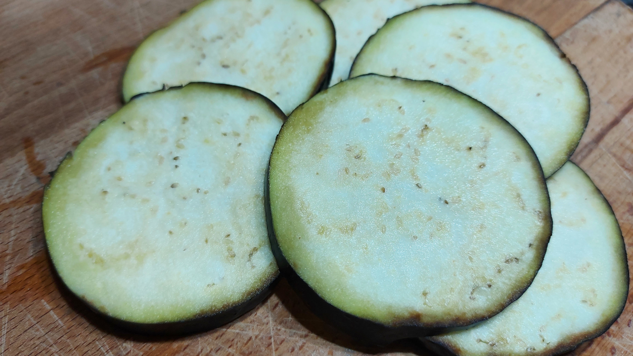Tagliatele le melanzane a fatte dello spessore di circa mezzo centimetro.