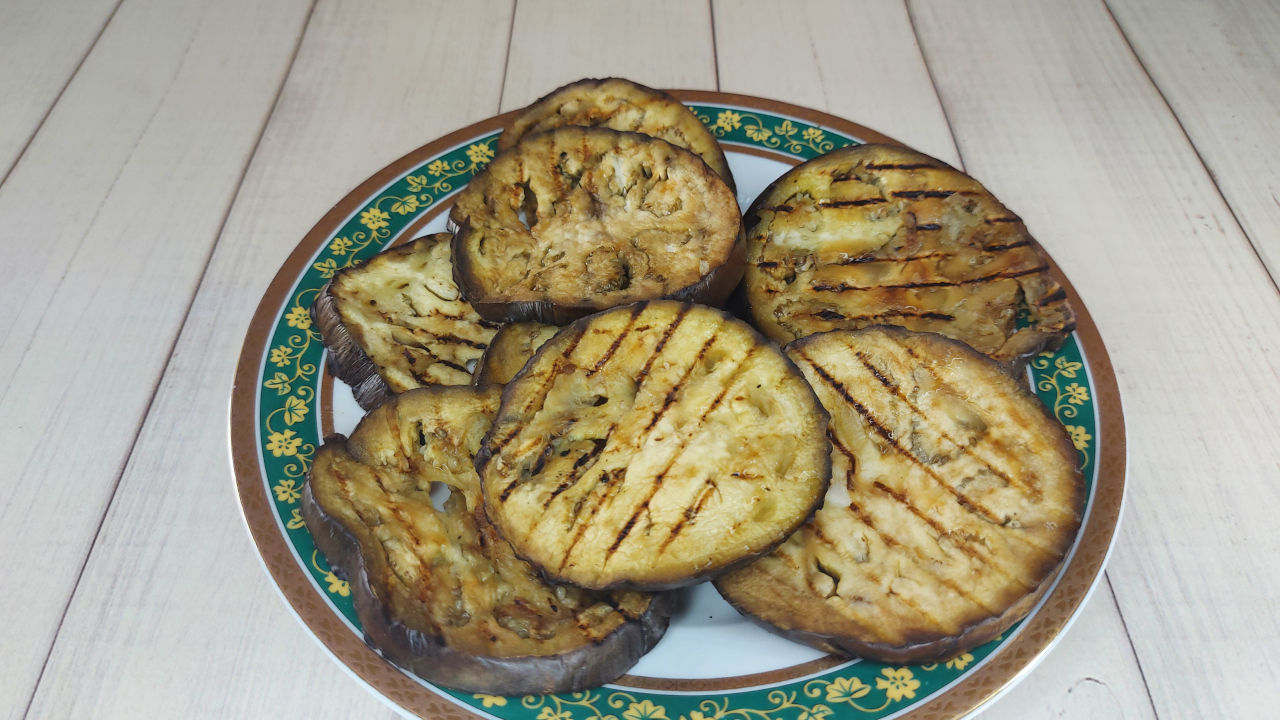 Fate scaldare bene una piastra di ghisa e disponeteci sopra le fette di melanzane senza sovrapporle.