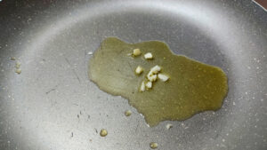 In una padella capiente fate scaldare l’olio extravergine d’oliva con l’aglio tagliato finemente.