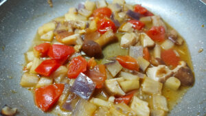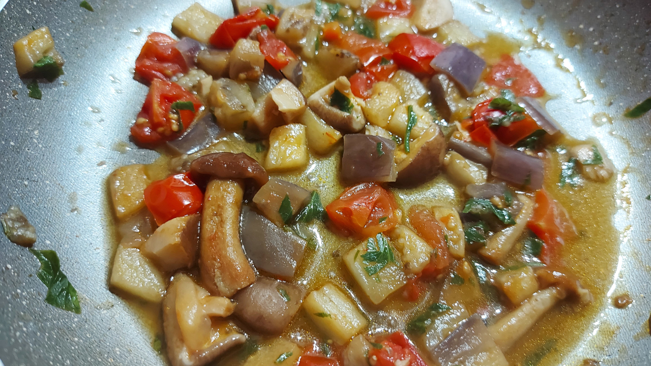 Quando l’aglio sarà rosolato aggiungete le melanzane e i funghi misti surgelati.