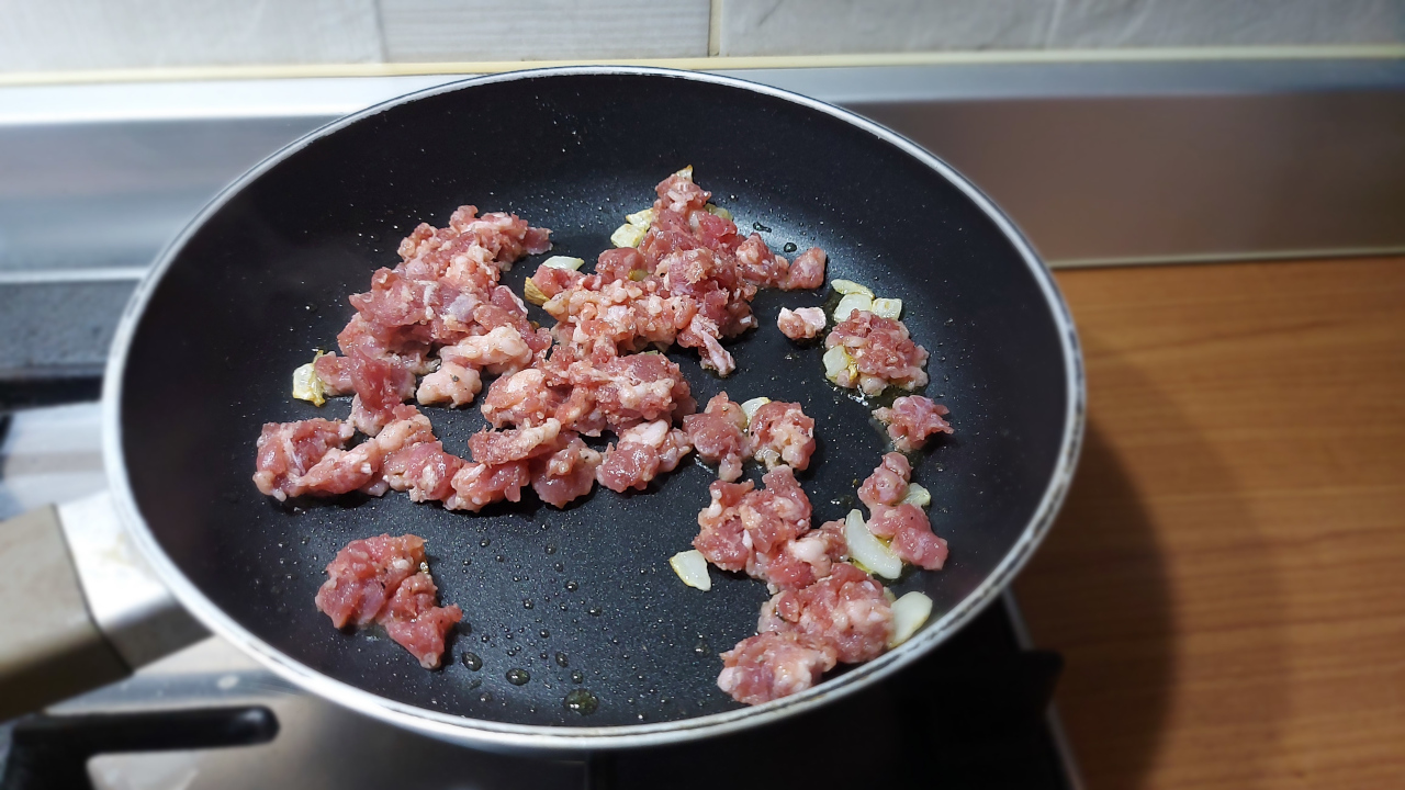 Tagliate la cipolla finemente e fatela rosolare in una padella antiaderente con un pò di olio extravergine d’oliva.