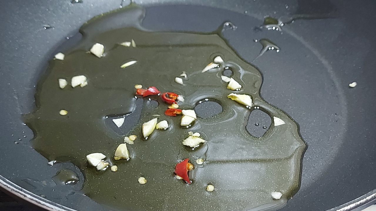Fate scaldare un pò di olio extravergine d’oliva in una padella antiaderente con l’aglio e il peperoncino.