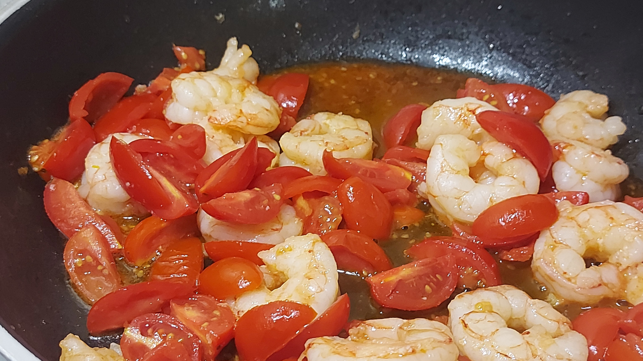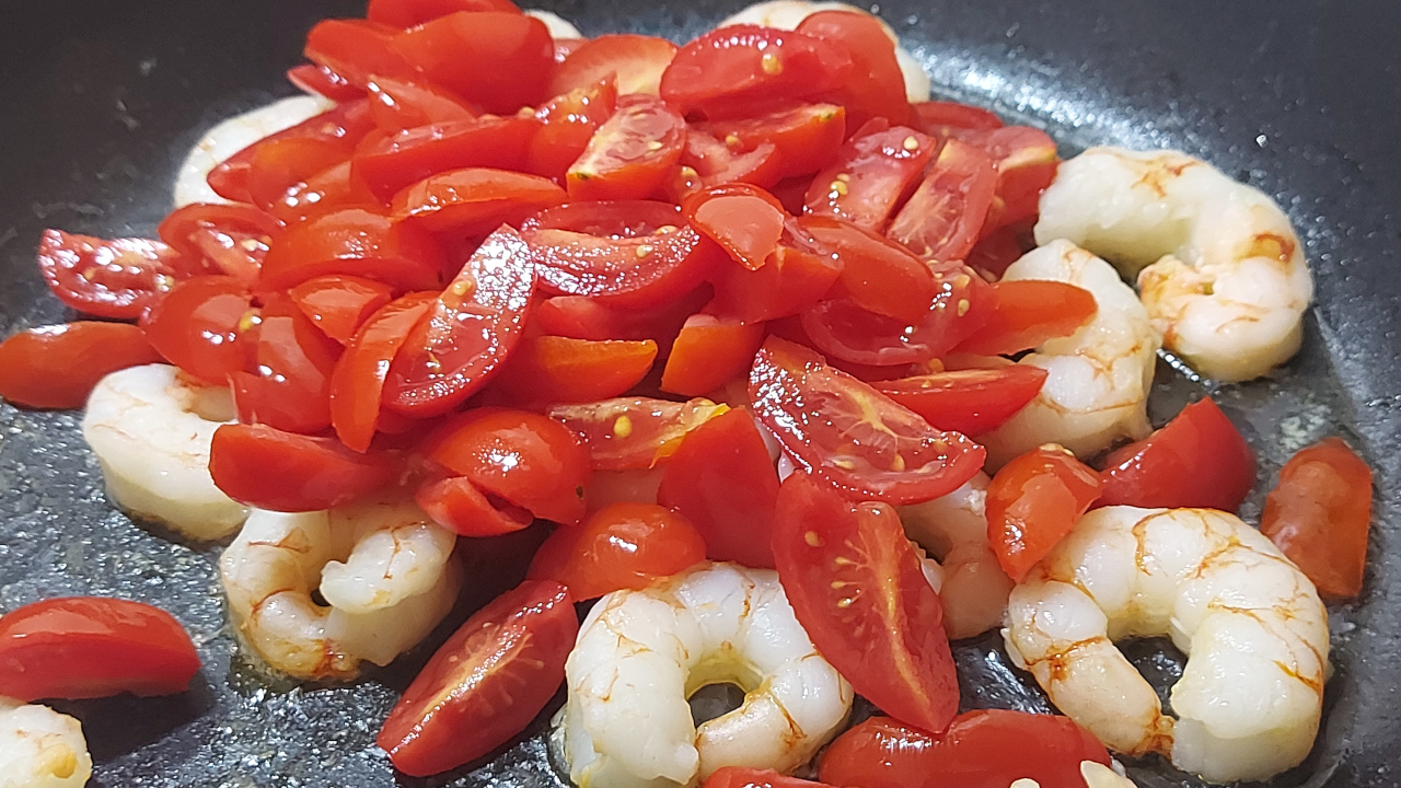 Tagliate i pomodorini a metà o in quattro parti se sono troppo grandi e uniteli ai gamberetti.