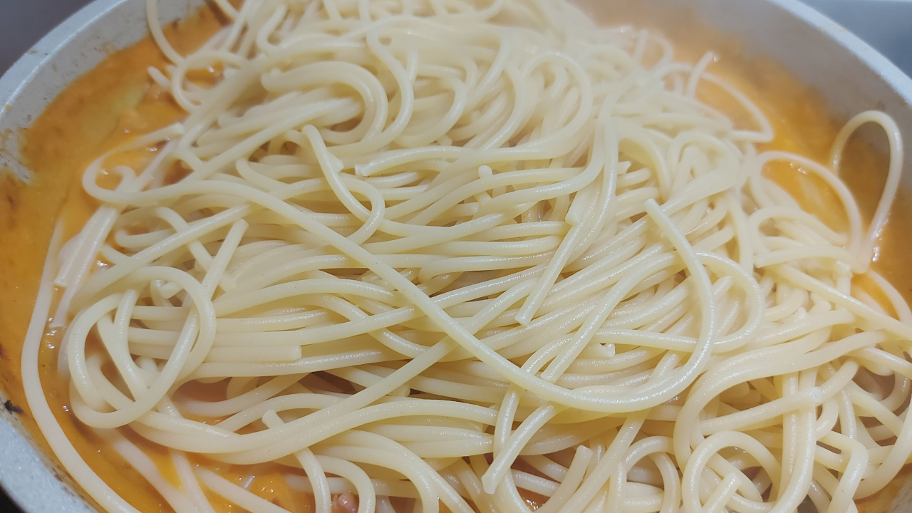Lessate la pasta in abbondante acqua salata, scolatela al dente e versatela direttamente nella padella con il condimento.