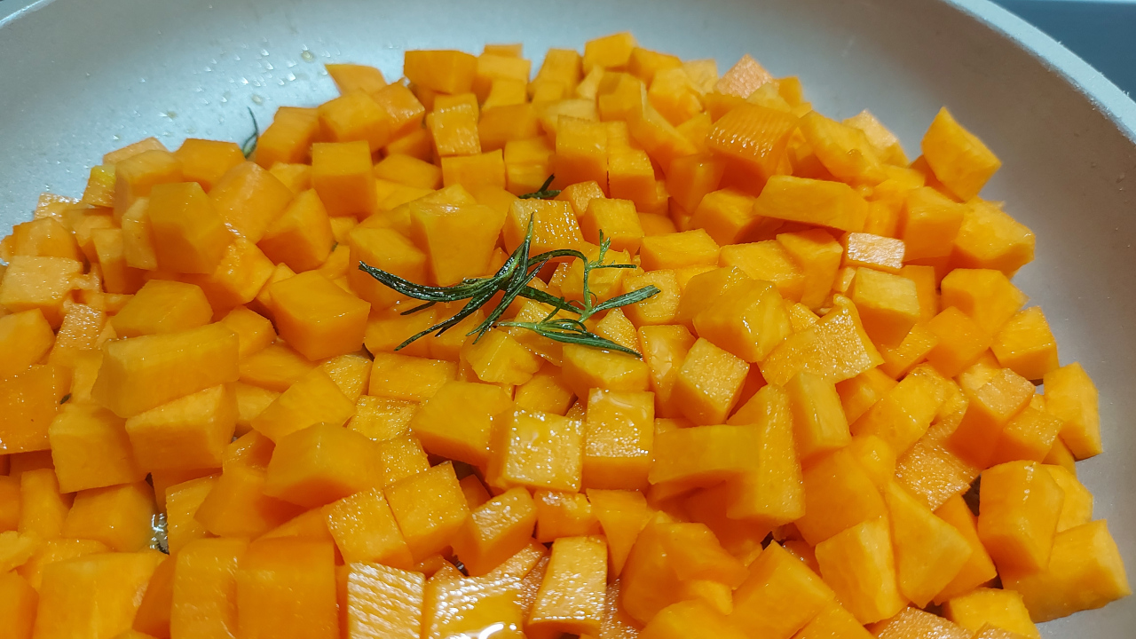 Aggiungete la zucca tagliata e lasciatela insaporire.