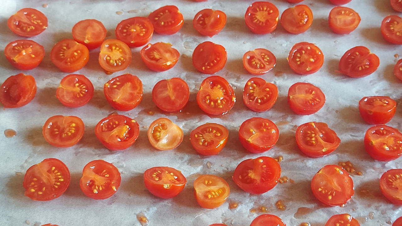 I pomodorini si condiscono con olio, sale, zucchero e aromi ne si cuociono in forno a bassa temperatura per concentrare i sapori.