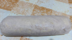 Arrotolate l’impasto aiutandovi con la carta da forno sigillando bene i bordi in modo da evitare che il ripieno fuoriesca.