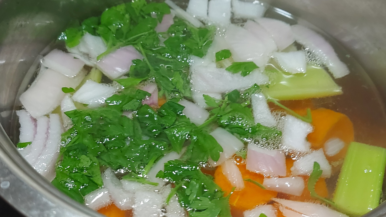 Innanzitutto preparate il court bouillon mettendo in una pentola l’acqua, il prezzemolo tritato, la carota, la cipolla e il sedano precedentemente puliti e tagliati a pezzi.