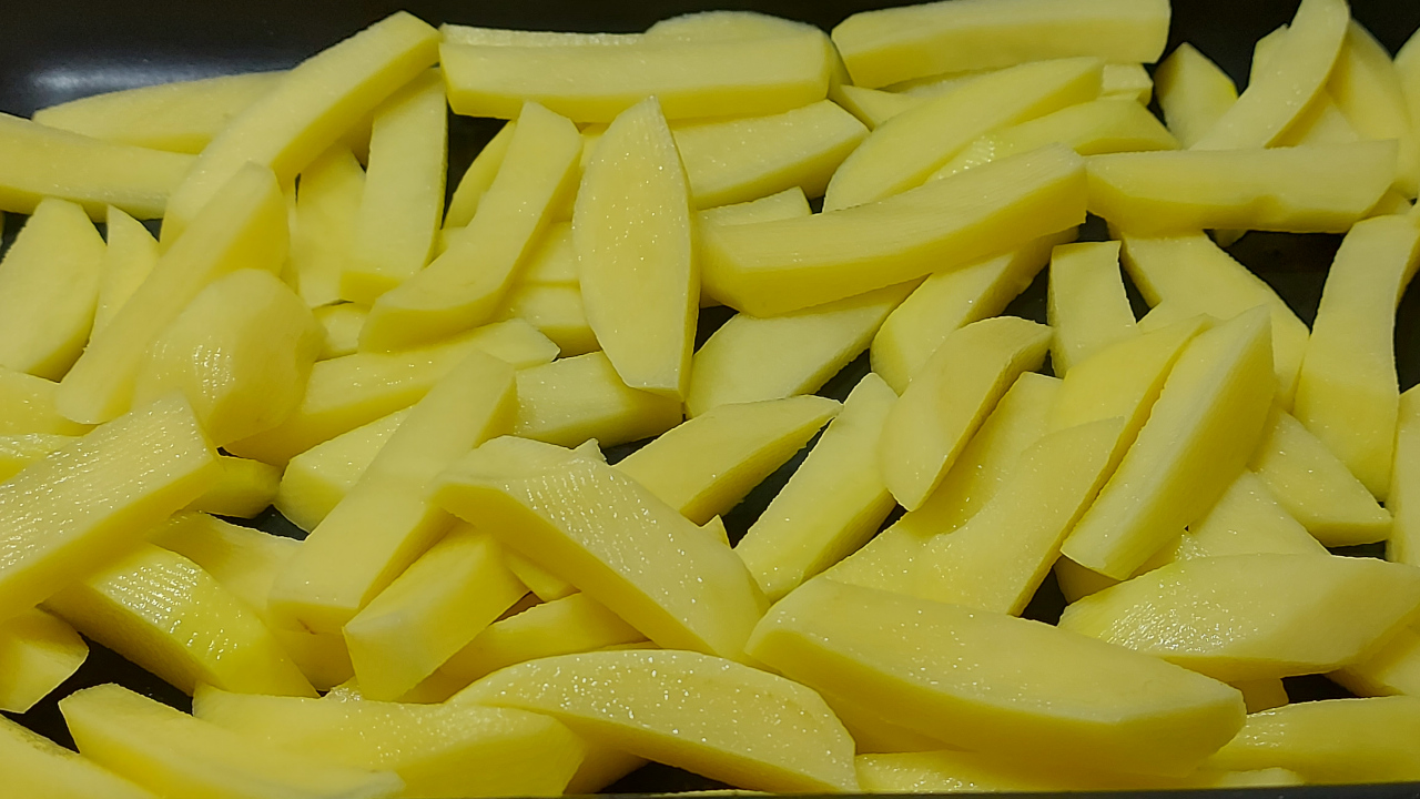 Tagliatele a spicchi all’incirca della stessa grandezza, per una cottura omogenea, e disponetele su una teglia da forno formando uno strato uniforme.