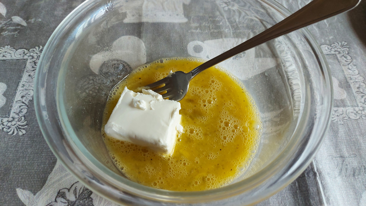 Sbattete l’uovo con una forchetta e aggiungete il sale, il pepe e le spezie.