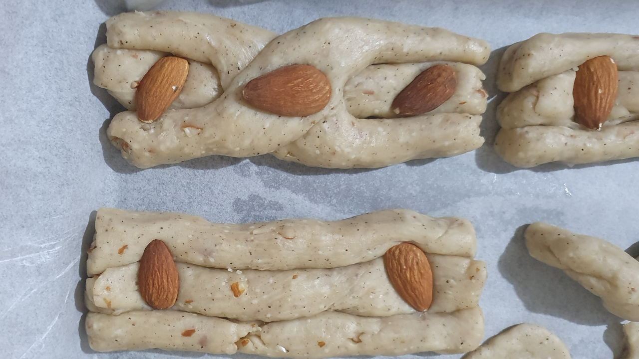 Bagnate le mandorle con un pò di acqua e mettetene tre su ogni tarallo facendo un pò di pressione per fissarle.