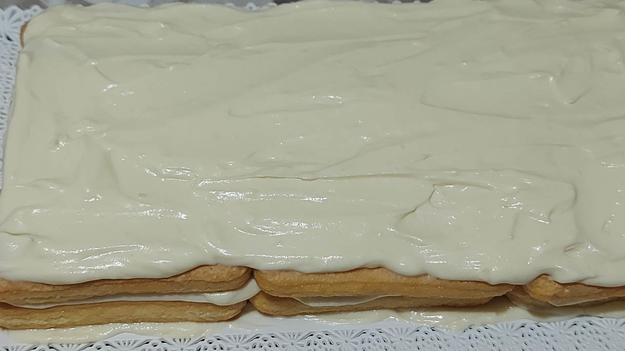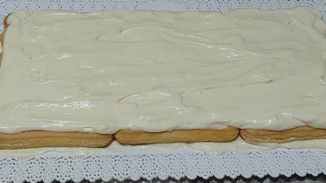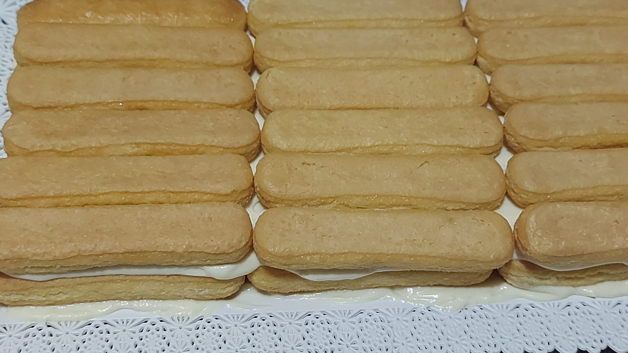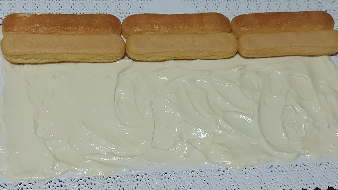 Bagnate velocemente i savoiardi nel latte e adagiateli sulla crema formando uno strato uniforme.