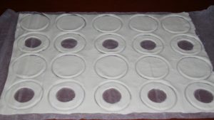 Stendete la pasta sfoglia su di un piano da lavoro e ricavate tanti dischetti della forma desiderata, utilizzando un bicchiere o un’apposita formina.